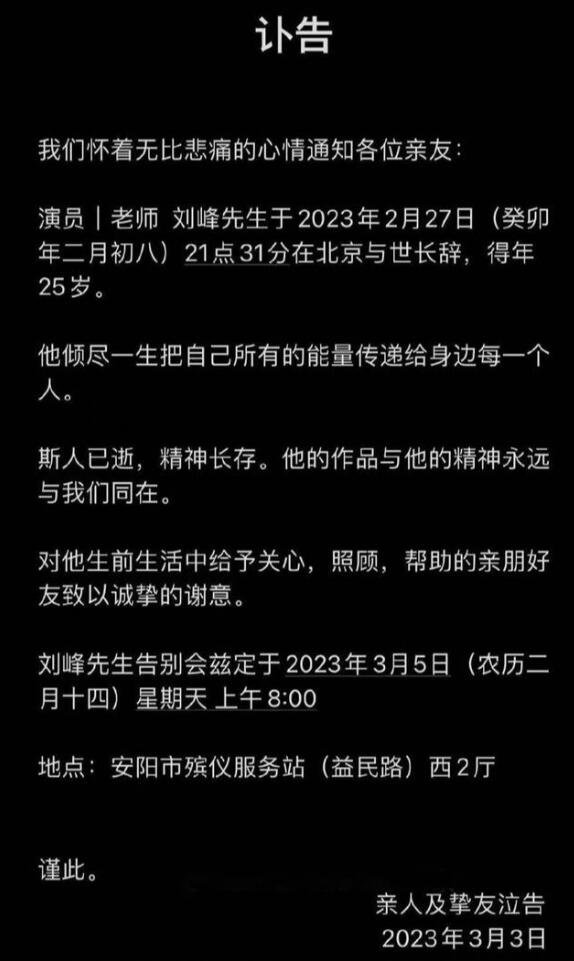 25岁男演员刘峰去世