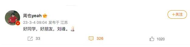 演员周也发文悼念:“好同学,好朋友,刘峰。”