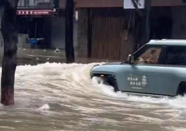 视频显示,上述车辆在行驶时激起水浪,有路人惊呼“海浪”,随后传来玻璃破碎、砸落水中的声音,有店铺卷闸门也被水冲至变形。有人上前拦截车主,指责其“在那摇来摇去三次了”。