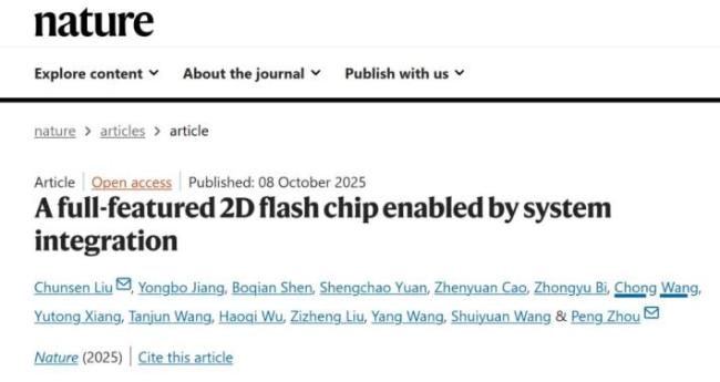 相关研究成果以《全功能二维-硅基混合架构闪存芯片》(A full-featured 2D flash chip enabled by system integration)为题,于北京时间10月8日晚间在《自然》期刊上发表。从原子级器件到功能芯片,跨越“从实验室到工厂”的鸿沟,大数据与人工智能时代对数据存取性能提出了极致要求,而传统存储器的速度与功耗已成为阻碍算力发展的主要问题之一。今年4月,周鹏-刘春森团队在《自然》期刊上提出“破晓”二维闪存原型器件,实现了400皮秒超高速非易失存储,是迄今最快的半导体电荷存储技术,为打破算力发展困境提供了底层原理。
