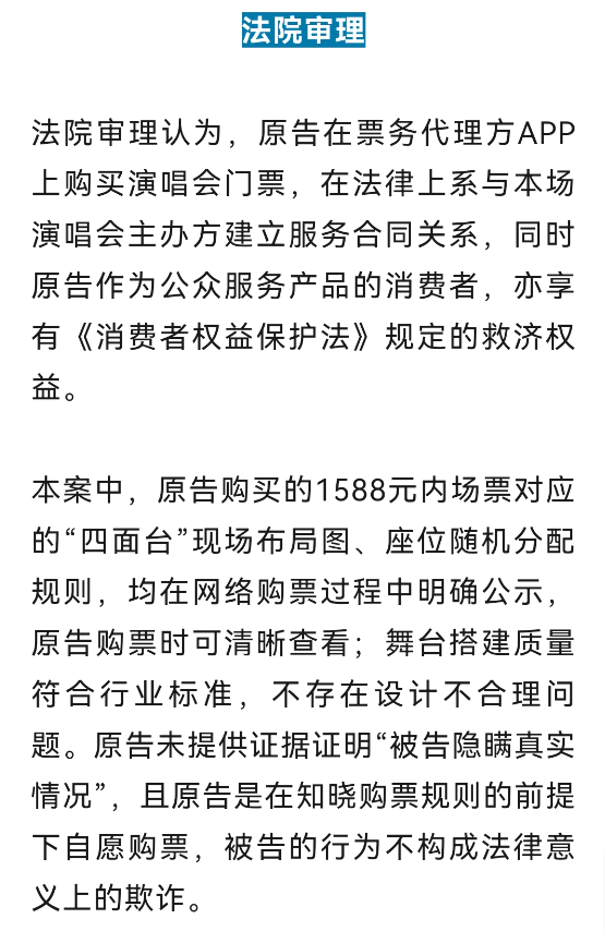 关于原告提出的“舞台设计不合理、视线受阻”问题,根据提供的证据,原告座位前方并没有柱子、栏杆等固定障碍物遮挡,视线受阻实际是由于前排观众与原告身高差异造成的,并非主办方可提前控制或避免。演唱会服务不仅包含视觉体验,还包括听觉享受、现场互动氛围和沉浸式参与感等多重维度。原告已按购票座位全程观看演唱会,双方的服务合同已履行完毕,现有证据无法证明主办方存在“未按约定提供服务”的违约行为。因此,法院依法驳回了原告的诉讼请求。