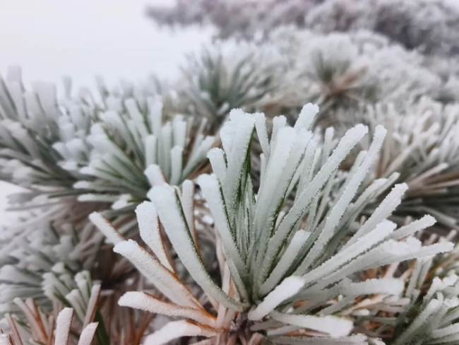 雾凇是黄山冬季的一大天然奇景,高海拔景区平均每年出现雾凇60多天,通常集中在11月下旬到次年3月上旬。当气温降至零摄氏度以下且雾气湿度较大时,水汽会附着在树木等物体上并冻结,形成美丽的雾凇景观。