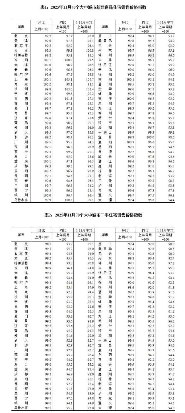 国家统计局今日公布数据显示,2025年11月份,70个大中城市商品住宅销售价格环比总体下降、同比降幅扩大。