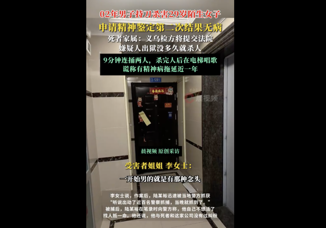 男子杀完人后在电梯唱歌。12月16日,浙江义乌,李女士告诉记者,她妹妹的案子“差不多快开庭了”。今年1月5日晚,她29岁的妹妹在上班的地方被一个素不相识的23岁男子陆某裕持刀杀害!