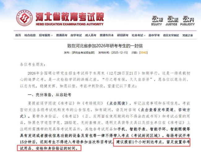 提前出门,留足时间。多地建议考生提前1小时到达考点,以便存放非考试用品、验证识别身份以及接受安检等。目前不少省份教育考试院已发布2026考研初试考前提示,如河南、河北、黑龙江等地均建议考生提前1小时到考点。考生应密切关注考试所在地的具体要求。
