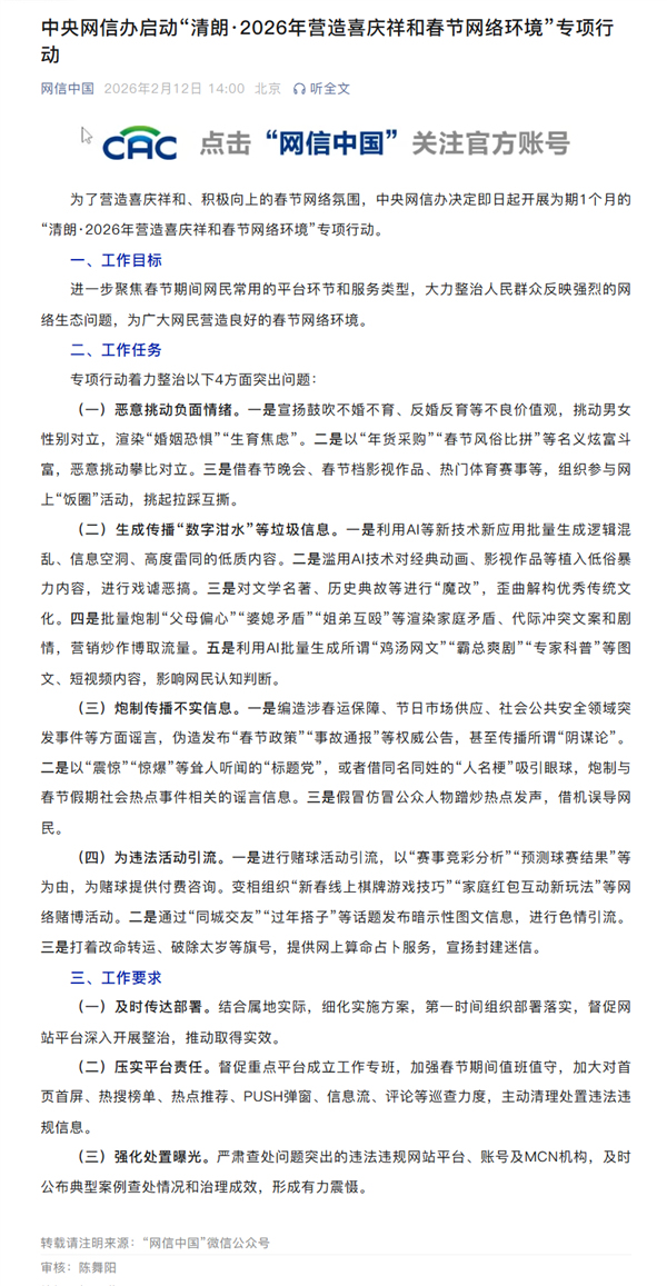 整治AI生成鸡汤网文霸总爽剧 清朗行动净化网络环境!中央网信办宣布,为营造喜庆祥和、积极向上的春节网络氛围,即日起开展为期一个月的“清朗·2026年营造喜庆祥和春节网络环境”专项行动。此次行动将聚焦春节期间网民常用的平台和服务类型,大力整治人民群众反映强烈的网络生态问题,为广大网民营造良好的春节网络环境。