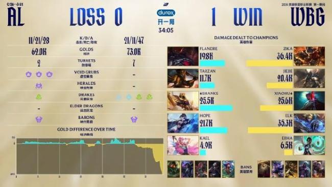 第一局中,AL选择了塞恩、皇子、沙皇、寒冰和萨勒芬妮,而WBG则选用了兰博、潘森、永恩、EZ和卡尔玛。前期双方人头交换频繁,但没有一方确立明显优势。尽管如此,WBG控制了更多的小龙。AL尝试通过Rush大龙来打破僵局,但Jiejie闪现接惩戒成功抢下大龙。Xiaohu的永恩大招命中多人,导致AL团战失败。最终WBG拿下龙魂后推进结束比赛。本局MVP是Jiejie。