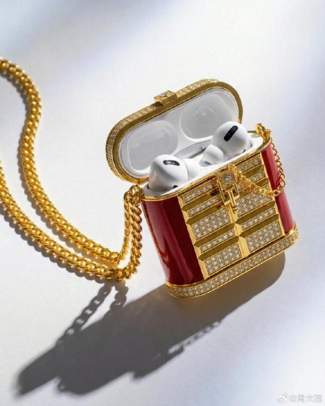这款镶钻黄金耳机包金重约350克,售价高达788800元。工作人员解释说,其工艺极为复杂,需经过大半年的手工打磨才能完成,售价中包含了高额的工艺附加值。界面新闻咨询了周大福天猫旗舰店客服,得知该店并没有这款黄金耳机包出售。不过,周大福官方微博当天发布了一系列图片介绍最新推出的品类,其中包括这款黄金耳机包等产品。