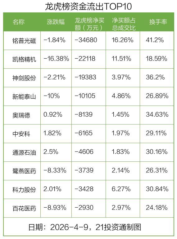 4月9日,上证指数下跌0.72%,深证成指下跌0.33%,创业板指下跌0.73%。盘后龙虎榜数据显示,共有44只个股因当日异动登上龙虎榜,光迅科技(002281.SZ)资金净流入最多,达11.25亿元。