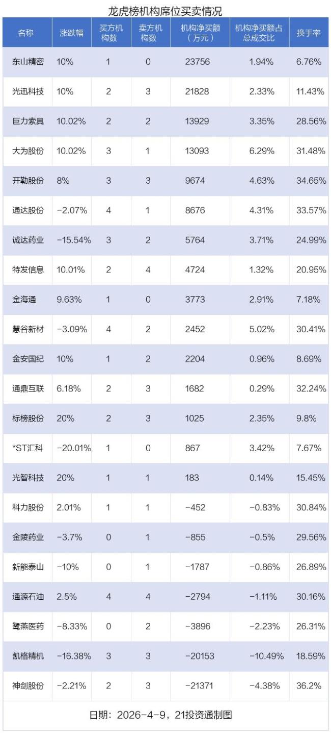 当天,22只个股龙虎榜出现了机构的身影,机构合计净买入6.23亿元。东山精密(002384.SZ)是机构净买入金额最多的个股,当日收盘上涨10%,换手率为6.76%。神剑股份(002361.SZ)是机构净卖出金额最多的个股,当日收盘下跌2.21%,换手率为36.2%。