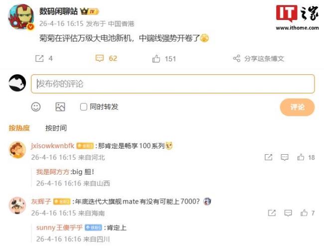 - 曝华为评估万级大电池新手机 中端线强势开卷