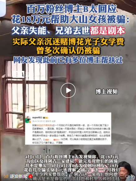 B太称花18万元帮扶女孩被骗 真相待查!4月14日,“B太回应18万帮扶被骗”成为热门话题。B太称他在帮助凉山布拖县的一位山区女孩之前,曾多次向女孩确认其家庭困难的情况是否真实,女孩均表示情况属实,当地村干部也确认了这一点。然而事后发现女孩所述与实际情况不符。凉山布拖县相关部门工作人员表示已关注此事,并正在调查。