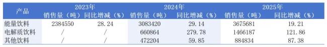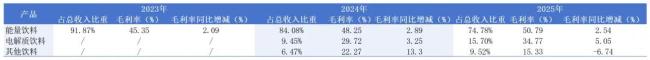 在东鹏饮料推出的“1+6”多品牌矩阵中,分为能量饮料(东鹏特饮)、电解质饮料(东鹏补水啦)和其他饮料(如东鹏大咖、果之茶等)三部分。梳理近三年财报可以看到,能量饮料占总收入的比重正在逐年降低。2023年,能量饮料的营收占比高达91.87%,2024年为84.08%,2025年降至74.78%。这背后,无疑是东鹏饮料看到了东鹏特饮的局限性,从而推出其他类型产品作为补充。尽管2025年东鹏特饮系列产品的年销量已达到367万吨,但同比增速已较2024年下降了近10个百分点。被视为“第二增长曲线”的东鹏补水啦也出现了销量增速放缓的情况,2024年年销量66万吨,同比增长279.78%;2025年年销量146万吨,同比增长121.86%,增速放缓一倍多。东鹏大咖、果之茶等情况也不容乐观,作为营收占比9.52%的其他饮料部分,其毛利率同比下降6.74%,是唯一毛利率同比下降的饮品部分。毫无疑问,这家年初成为“A+H”双平台上市的饮料企业正面临着产品青黄不接的局面——东鹏特饮增速放缓,其余产品还不具备完全的接棒能力。