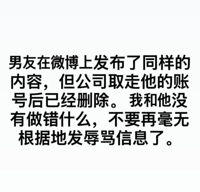 这位绯闻女友还提到,男友曾在微博上发布了同样的内容,但公司的干预导致该内容已被删除。她重申自己和男友没有做错什么,呼吁大家不要继续无端谩骂。