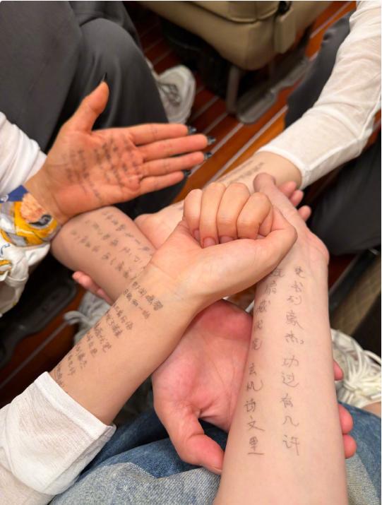 合照中可以看到几位姐姐为了准备小考,在胳膊上写满了台词笔记。